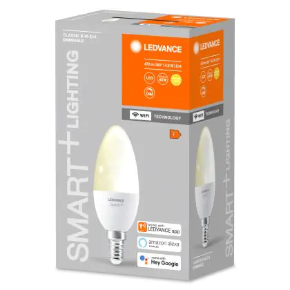 Cette ampoule Ledvance Smart+ Wifi E14 Bougie 5W 470lm - 827 | Dimmable - Remplacement 40W avec son efficacité lumineuse de lumen par watt vous permettra de profiter d’un éclairage de qualité. Avec sa durée de vie de 20000 heures, vous n’aurez pas à vous soucier de son remplacement avant quelques années.