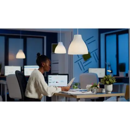 Lorsque vous réduisez l'intensité de vos lumières, vous n'utilisez pas la pleine puissance pour les faire fonctionner. Vous faites donc des économies supplémentaires sur les coûts énergétiques. Avec des ampoules dimmables, vous pouvez également créer une atmosphère plus chaleureuse. Gardez à l'esprit que vous avez besoin d'un variateur de lumière pour faire varier l'intensité des lumières LED ("dimmer"). Vous voulez en savoir plus sur l'éclairage dimmable ? Lisez notre article de blog.